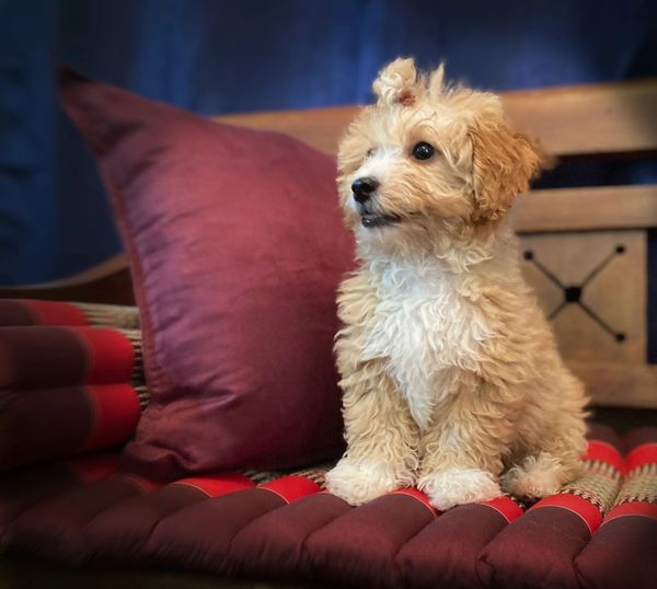 Ranger is a miniature F1 Cockapoo with a beautiful light-colored coat and distinct markings (i.e. white chest, face, boots and tail tip. We hope he will be the sire of many F1b Cockapoos in the future.